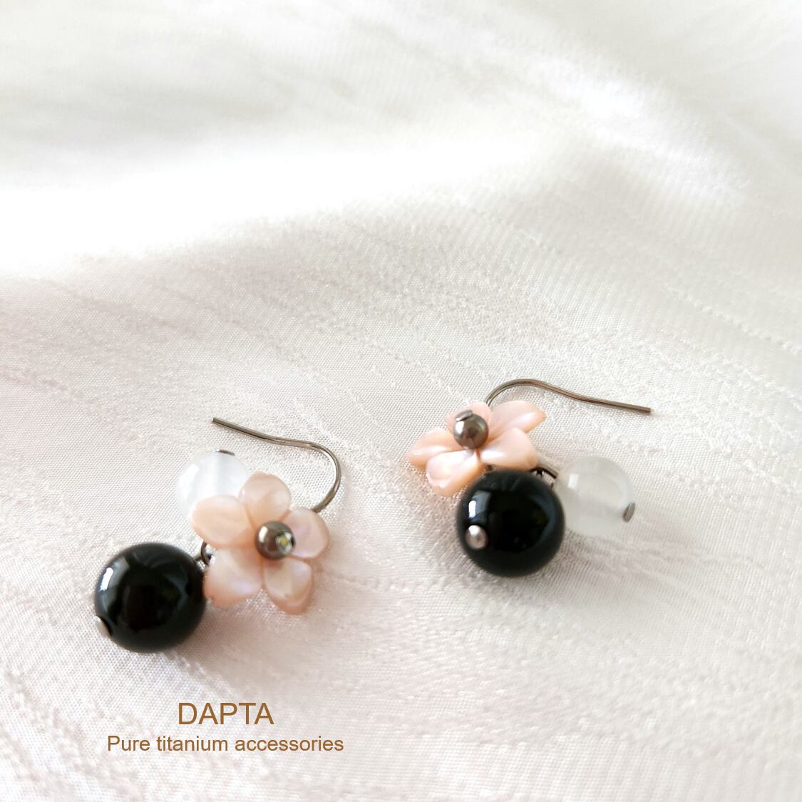 配色: 漆黒のオニキスと、ピンク色の光を反射するマザーオブパールのシェルフラワー、そして淡い色合いのムーンストーンが可愛らしさの中に大人の印象を与えます。このブラックとホワイト、そしてピンクの組み合わせが、引き締まった耳元に優しさが足され、視覚的なアクセントとなっています。