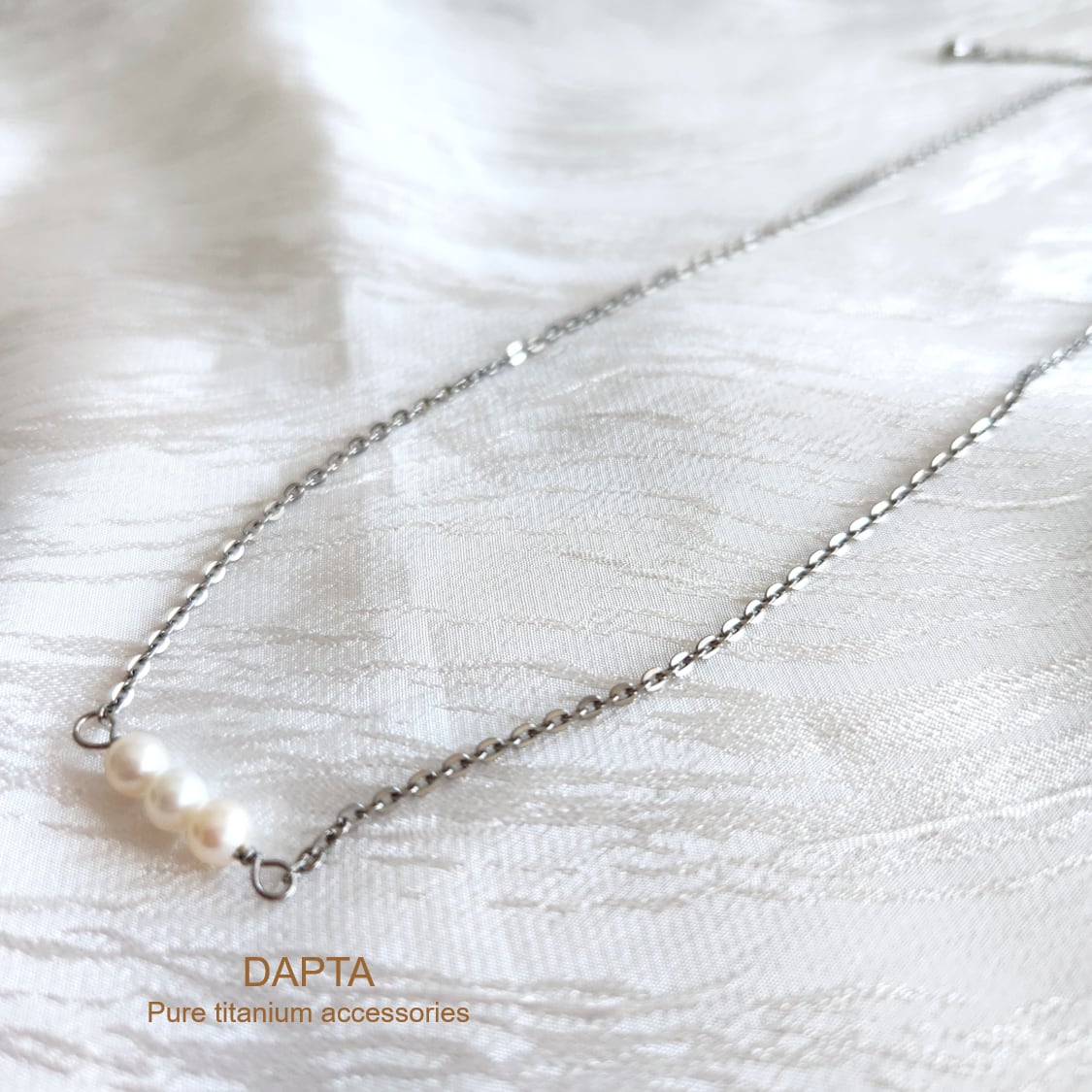 清らかな光沢を持つ5mm玉の淡水パールを3つ連ね、シンプルながら気品あふれるネックレスに仕立てました。チェーンの長さは約41cm。鎖骨にそっと寄り添い、装いに控えめながらも確かな存在感を添えてくれます。