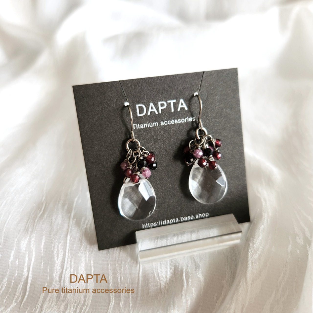 透明感あふれるクリスタルのドロップに、深紅のガーネット、漆黒のブラックスピネル、そしてボルドーブラウンのキュービックジルコニアを添えた、上品なピアスに仕立てました。